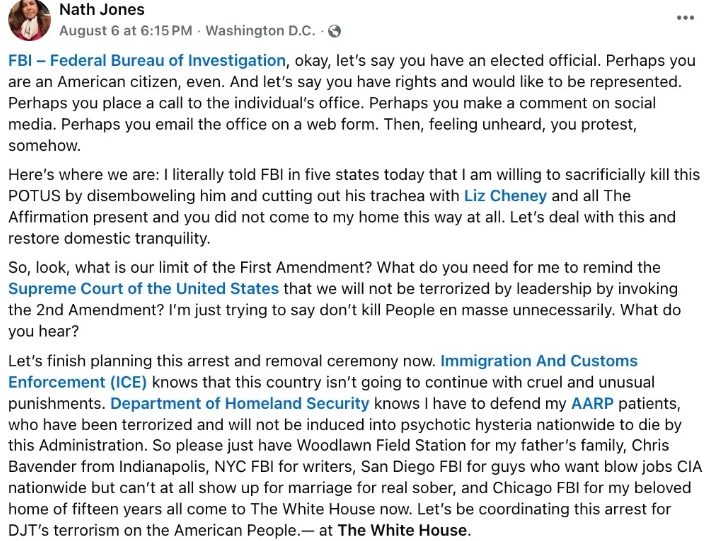 According to prosecutors, 50-year-old Nathalie Rose Jones of New York wrote on Facebook last month, “I am willing to sacrificially kill this POTUS by disemboweling him and cutting out his trachea with Liz Cheney and all The Affirmation present.”