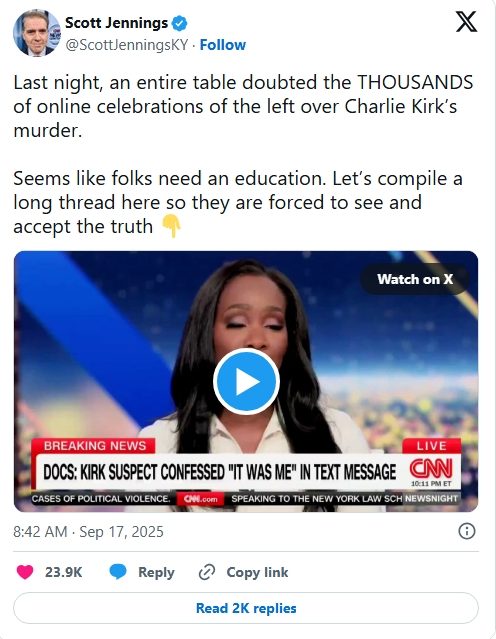 Jennings snapped back, pointing out, “The person who shot Charlie Kirk was a ‘random person in the world,’ was he not? That’s the danger. You dismiss the random people of the world. They have access to weapons and hateful motivation.”