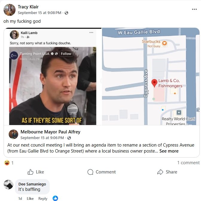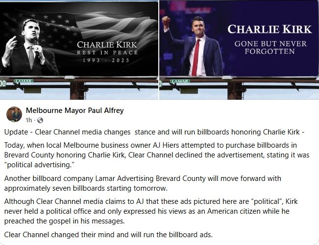 In Brevard County, Melbourne Mayor Paul Alfrey announced on social media that prominent business owner AJ Hyers attempted to purchase billboard space displaying a Charlie Kirk memorial at which he was denied.