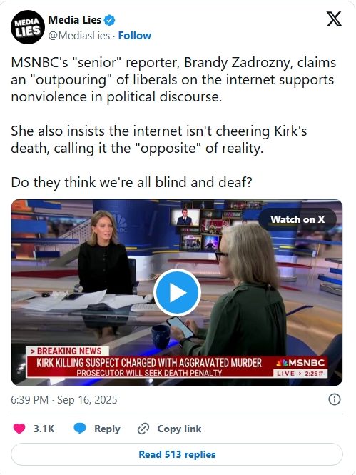 Meanwhile, MSNBC Senior Reporter Brandy Zadrozny commented, “There are people saying, ‘No love lost for Charlie Kirk.’ It’s just that is more rare than the outpouring of people who said, ‘We do not want this kind of violence.'”